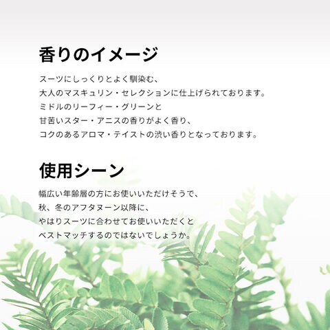プロデュースは「P&G PRESTIGE BEAUTE」。ミドルのリーフィー・グリーンと甘苦いスター・アニスの香りがよく香り、コクのあるアロマ・テイストの渋い香りとなっております。幅広い年齢層の方にお使いいただけそうで、秋、冬のアフタヌーン以降に、やはりスーツに合わせてお使いいただくとベストマッチするのではないでしょうか。