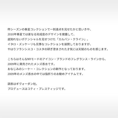 昨シーズンの春夏コレクションで一到達点を見せたかと思いきや、2010年春夏では更なる完成度のデザインを披露して、底知れないポテンシャルを見せつけた「カルバン・クライン」。イタロ・ズッケーリも見事なコレクションを展開しておりますが、やはりフランシスコ・コスタの研ぎ澄まされた才気には天賦のものを感じます。こちらはそんなNYモードのアイコン・ブランドのフレグランス・ラインから、2009年に発売されたメンズ香水です。