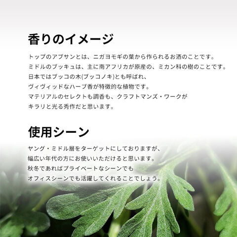 調香はギヴォーダン社。プロデュースはコティ・プレスティッジです。トップのアブサンとは、ニガヨモギの葉から作られるお酒のことです。ミドルのブッキュは、主に南アフリカが原産の、ミカン科の樹のことです。日本ではブッコの木(ブッコノキ)とも呼ばれ、ヴィヴィッドなハーブ香が特徴的な植物です。マテリアルのセレクトも調香も、クラフトマンズ・ワークがキラリと光る秀作だと思います。
