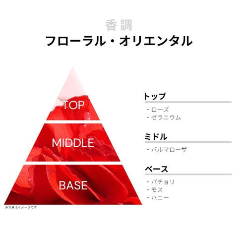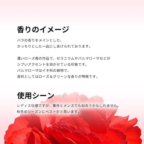 ローズやゼラニウムなどが、エレガントで格調高いようなロージー・スパイシーを香り立たせるトップから、
