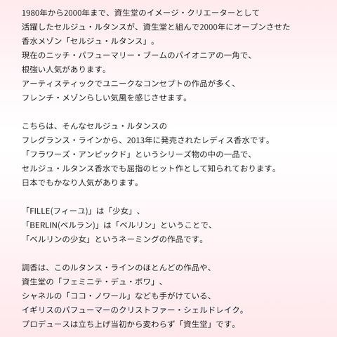 「フラワーズ・アンピックド」というシリーズ物の中の一品で、セルジュ・ルタンス香水でも屈指のヒット作として知られております。日本でもかなり人気があります。