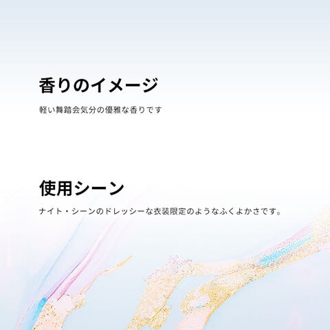 ●フレグランス商品は、シルク・薄い布地や白または淡い色の衣服には、シミになることがありますので、直接おつけにならないでください。