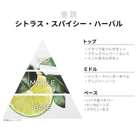 イタリア産ベルガモット、ブラックペッパー、エレミ、インド産カルダモンなどが、エナジャイジングなシトラス・スパイシーを香り立たせるトップから、