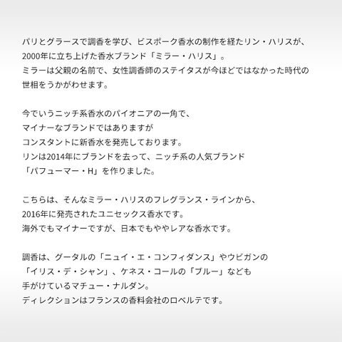 こちらは、そんなミラー・ハリスのフレグランス・ラインから、2016年に発売されたユニセックス香水です。海外でもマイナーですが、日本でもややレアな香水です。