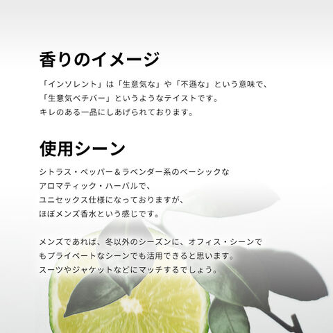 「インソレント」は「生意気な」や「不遜な」という意味で、「生意気ベチバー」というようなテイストです。香りはシトラス・スパイシー・ハーバルの香調がベース。キレのある一品にしあげられております。