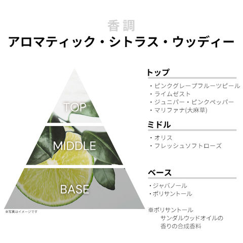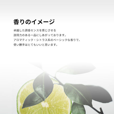 香りは、アロマティック・シトラス・ウッディーの、力感のある香調がベース。卓越した調香センスを感じさせる、説得力のある一品にしあがっております。