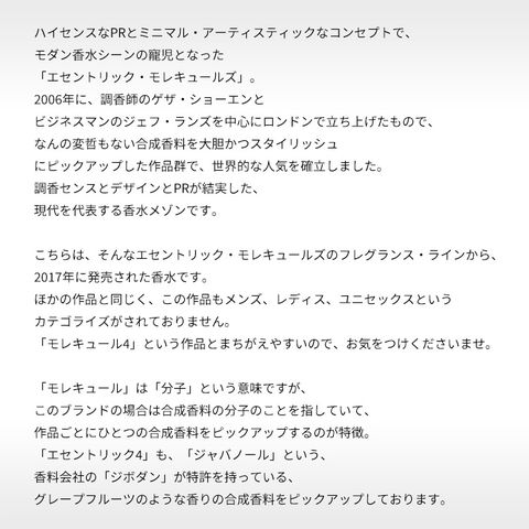 こちらは、そんなエセントリック・モレキュールズのフレグランス・ラインから、2017年に発売された香水です。ほかの作品と同じく、この作品もメンズ、レディス、ユニセックスというカテゴライズがされておりません。「モレキュール4」という作品とまちがえやすいので、お気をつけくださいませ。
