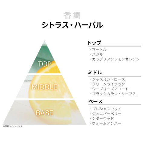 マートル、バジル、カラブリアン・レモン、オレンジなどが、クリアでキリッとしたシトラス・ハーバルを香り立たせるトップから、