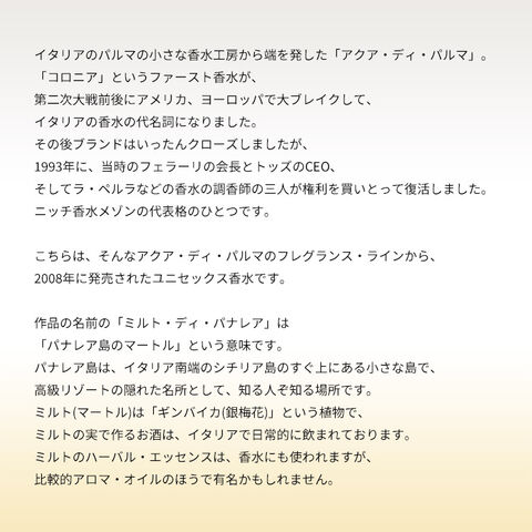 そんなパナレア島のミルトをフィーチャーしたこの作品は、シャープでキレのあるシトラス・ハーバルの香調がベース。サマーシーズンにうってつけの、爽快な一品にしあがっております。