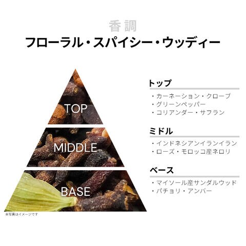カーネーション、グリーンペッパー、コリアンダー、サフラン、クローブなどが、エキゾチックなスパイシー・ノートを香り立たせるトップから、