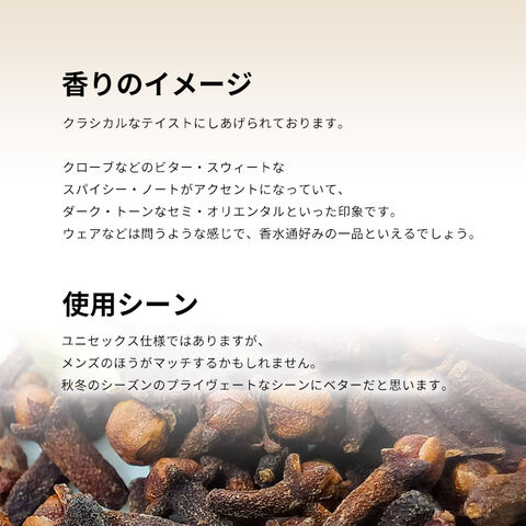 クローブなどのビター・スウィートなスパイシー・ノートがアクセントになっていて、ダーク・トーンなセミ・オリエンタルといった印象です。ユニセックス仕様ではありますが、メンズのほうがマッチするかもしれません。秋冬のシーズンのプライヴェートなシーンにベターだと思います。