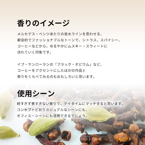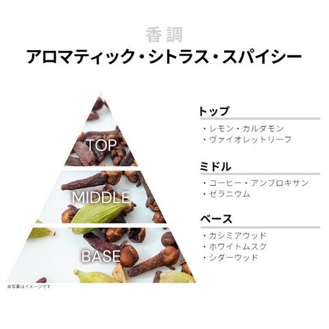 香りは、キリッとスタイリッシュなアロマティック・シトラス・スパイシーの香調がベース。コンテンポラリーで精悍なイメージのアイテムにしあがっております。