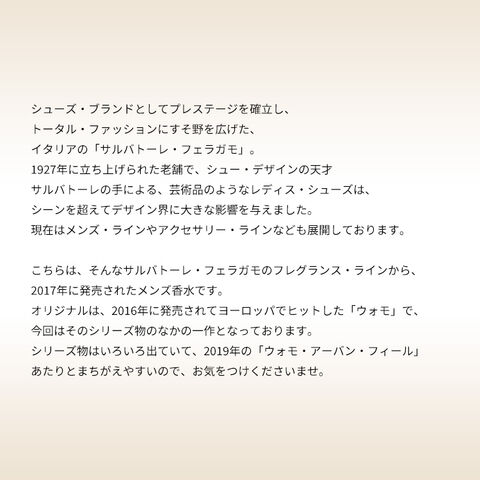 こちらは、そんなサルバトーレ・フェラガモのフレグランス・ラインから、2017年に発売されたメンズ香水です。