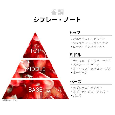 ベルガモット、オレンジ、シクラメン、イランイラン、ローズ、ポメグラネイトなどが、すっきりと切り立つようなシトラス・フレッシュを香り立たせるトップから、