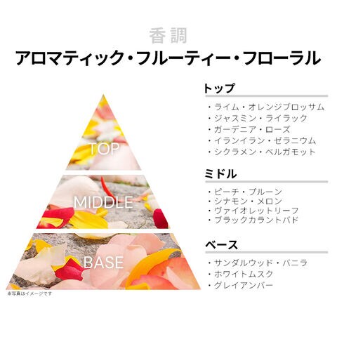 ライム、ベルガモット、ジャスミン、ライラック、ガーデニア、ローズ、イランイラン、ゼラニウム、シクラメン、オレンジブロッサムなどが、快活で気高いシトラス・フローラルを香り立たせるトップから、