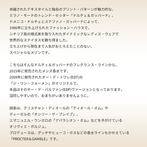 こちらはそんなドルチェ&ガッバーナのフレグランス・ラインから、2015年に発売されたメンズ香水です。2008年に発売されたオー・デ・トワレ(EDT)の「ジ・ワン・フォーメン」がオリジナルで、今回はそのオー・デ・パルファン(EDP)ヴァージョンとなっております。混同しやすいので、おまちがいありませんように。