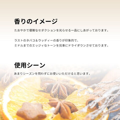 香りは、ダンディズムを感じさせる、大人のアロマティック・スパイシー・ウッディーの香調がベース。たおやかで優雅なセダクションを光らせる一品にしあがっております。