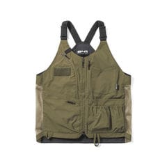 かぶりタイプのベストは、ややゆったりとしたシルエット。左肩部分にはスマートフォンや鍵などが収納できるポケットを搭載。肩や裾はすっきりとしたバインダー仕様で、ミドラーとして重ね着しやすくしています。