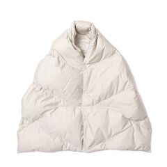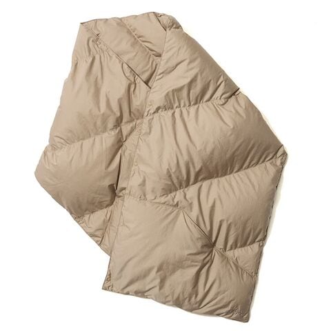大判なシルエットのダウンポンチョマフラー。同素材やのNO COLLAR DOWN COAT / ノーカラーダウンコートとセットアップで着用可能。