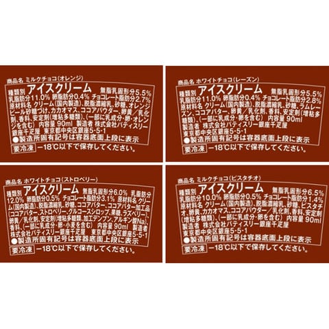 ・ミルクチョコ(オレンジ):クリーム(国内製造)、脱脂濃縮乳、砂糖、オレンジピール砂糖づけ、カカオマス、ココアパウダー、卵黄/乳化剤、香料、安定剤(増粘多糖類)、(一部に乳成分・卵、オレンジを含む)