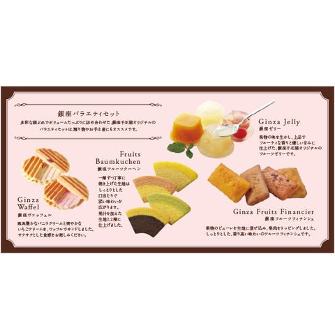 ・銀座ゼリー:【キウイ】キウイシロップ漬け(キウイ(チリ産)、砂糖)、砂糖、洋酒、レモン果汁/ゲル化剤(増粘多糖類)、酸味料、香料、酸化防止剤(V.C)、着色料(紅花黄、クチナシ)【ブルーベリー】ブルーベリーシロップ漬け(ブルーベリー(カナダ産)、砂糖)、砂糖、ブルーベリー濃縮果汁、レモン果汁/ゲル化剤(増粘多糖類)、酸味料、香料【グレープフルーツ】グレープフルーツシロップ漬け(グレープフルーツ(トルコ産)、砂糖)、砂糖、グレープフルーツ濃縮果汁、レモン果汁/ゲル化剤(増粘多糖類)、酸味料、香料、酸化防止剤(V.C)【マンゴー】マンゴーシロップ漬け(マンゴー(タイ産)、砂糖)、マンゴーピューレ、砂糖、レモン果汁/ゲル化剤(増粘多糖類)、酸味料、香料、酸化防止剤(V.C)【さくらんぼ】さくらんぼシロップ漬け(さくらんぼ(国産)、砂糖)、砂糖、洋酒、レモン果汁/ゲル化剤(増粘多糖類)、酸味料、香料、酸化防止剤(V.C)、ラック色素【ラ・フランス】ラ・フランスシロップ漬け(ラ・フランス(国産)、砂糖)、砂糖、ラ・フランス濃縮果汁、洋酒、レモン果汁/ゲル化剤(増粘多糖類)、酸味料、香料、酸化防止剤(V.C)