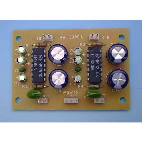 パワーアンプIC「LM380」を2個搭載したステレオパワーアンプの完成基板です。最大出力は2.4W+2.4W(4Ω時)、携帯用オーディオの外付けアンプとしてもご利用ください。
