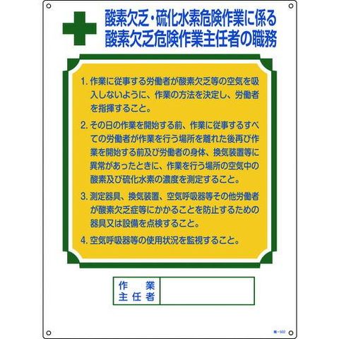 日本緑十字社 049502 職-502 職務標識板×酸素欠乏×硫化水素 600×450 硬質エンビ