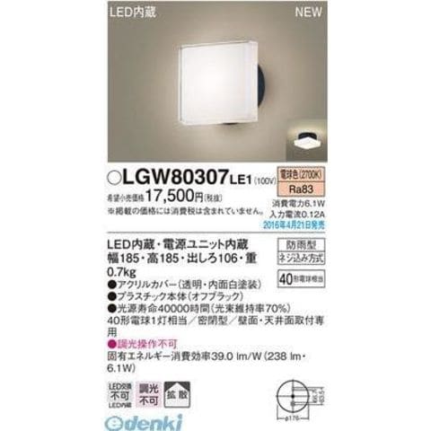 パナソニック LGW80307LE1 LEDポーチライト 電球色 エクステリアライト Panasonic 壁直付型 防雨型