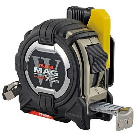 ●【機能・特長】長尺7.5mテープを採用しています。一人でピッチ出しができる本体と爪のダブルマグ仕様です。吸着力が高く握りやすい新設計の縦長磁石です。片手で簡単脱着できる、落下防止用ベルトホルダー付です。落下時の衝撃から爪を守るフックガードバンパー付です。