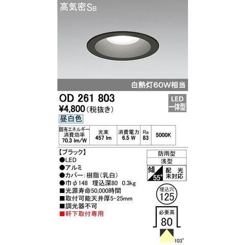 オーデリック ODELIC OD261803 LEDダウンライト 昼白色 防雨型 軒下取付専用 高気密SB形 ブラック 照明器具