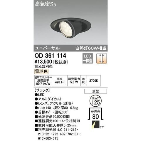 オーデリック ODELIC OD361114 LEDダウンライト 電球色 LEDユニバーサルダウンライト 高気密SB形
