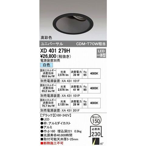 オーデリック ODELIC XD401279H LEDダウンライト CDM-T70Wクラス