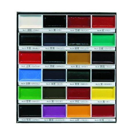 ●胡粉、黒、本藍、浅葱、青草、白緑、黄、黄土、上朱、岱赭、臙脂、紅梅、紫、群青、白群、緑青、若草、紅、藤紫、深緑、鴬、焦茶、山吹、洋紅