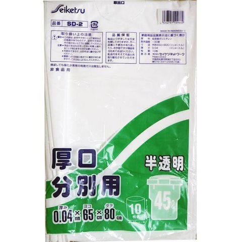 4976797109669 セイケツネットワーク 分別用ごみ袋 半透明 45L 厚口 0.04×650×800mm 10枚入【キャンセル不可】
