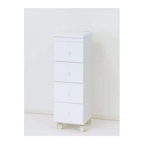 ●キッチンや洗面所の隙間に収納できるスリムな収納ワゴン、キャスター付で移動もラクラク。清潔感のあるホワイト色。天板・前面は汚れ等のお手入れが簡単です。