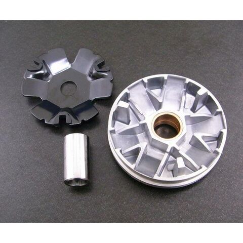 プーリーローラーガイドをノーマルよりも外側へ引き伸ばし、またプーリー角度を1度あげる事で最高速を大幅に向上させます。角度変更を1度に抑えている為、純正調のドライブVベルトに対応しており、加速への影響は限定的です。またプーリーを肉薄化し加速アップにも貢献しています。加速/トップスピードを大幅に向上させるオススメのハイスピードプーリーです。