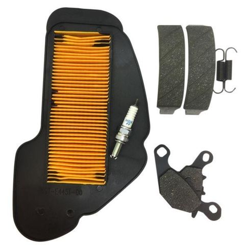 エンジンの始動や走行が怠くなった時に疑われるエアフィルターと、またそれを交換する時に同時交換を推奨しているスパークプラグをセットにしました。またその頃から消耗しているであろうブレーキシューもキットにしました。当キットのブレーキシューは高温時でも変質が少ない素材を採用、耐久性が高く優れた制動力を発揮します。シュー部分に溝を刻む事で粉塵が溜り難く冷却効果のある構造を採用しています。