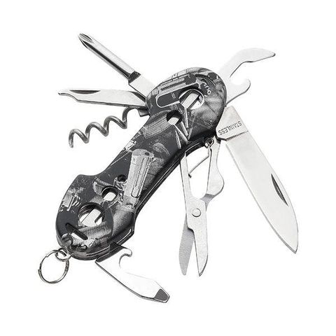 機能は缶切り・ナイフ・はさみ・爪そうじ・ヤスリ・マイナスドライバー・プラスドライバー・栓抜き・コルク抜き・キーリングです。【仕様】