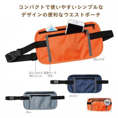 アクティブなアウトドアシーンでの小物を、最小限に抑えたい時などにオススメです。ウォーキング・お散歩などにたいへん便利。またウエストポーチは両手があくので、安心・安全です。旅行途中で貴重品を、紛失や盗難から守る『腰に巻くタイプの貴重品入れ』としても便利です。薄手で服の下にも隠せます。2つのファスナーポケットがあり、小分けが可能になっています。ポーチ表側には、反射テープ付き。ワンタ