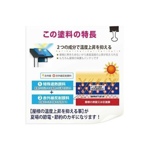 ●特長:・特殊遮熱顔料と赤外線反射顔料が赤外線を反射し、同じ色の従来塗料と比較して屋根の表面温度の上昇を抑えます。また室内温度の上昇を抑える効果もありますので、節電・省エネ効果も期待できます。・遮熱顔料と高耐久アクリル・シリコン樹脂配合のWブロック効果で、紫外線・排ガス・雪・酸性雨など外敵から建物を守り、長期間風合い・ツヤを保ちます。・臭いが少なく、乾燥も速く、使いやすい水性タイプ。※乾くと雨や水で流れ落ちる事はありません。・防カビ剤配合だからをカビの発生から守ります。