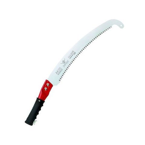 ●高い枝を切る時には好みの長さの木の棒をハンドルに差し込んで使用し、低い枝を切る時は、棒を抜いてお使い頂ける枝切り鋸です。先端のフックつき刃は枝を切る時に鋸が枝から外れないので、素人の方でも大変使いやすくなっています。鋸刃を「厚め」に仕上げておりますので、少々無理な使い方をしても曲がったり折れたりせず力強く安定した切れ味を発揮します。