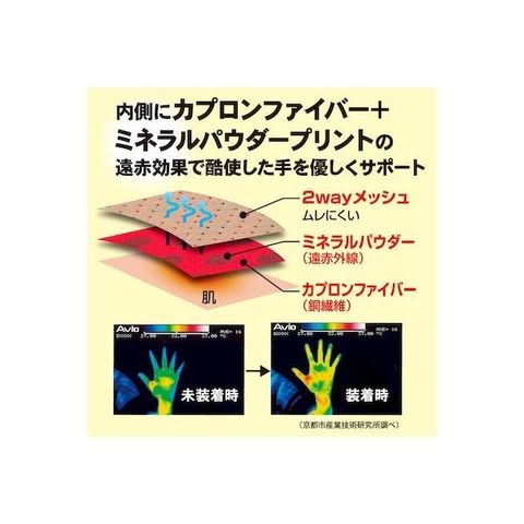 ●内側にカプロンファイバー+ミネラルパウダープリントの遠赤効果で酷使した手を優しくサポート