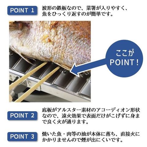 ●底板がアルスター素材のアコーディオン形状だから遠火効果で表面だけがこげずに身まで良く火が通ります。また、焼いた魚・肉などの油が本体に落ち、直接火にかかりませんので煙が出にくいです。