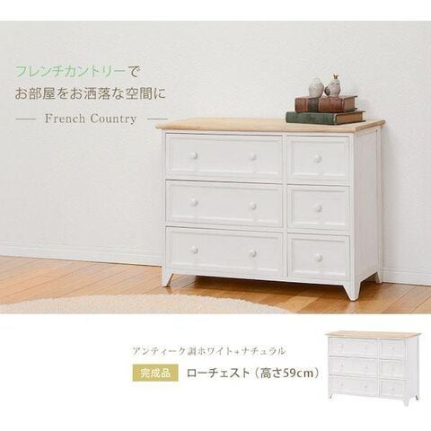 ●シャビーホワイトの本体にアンティーク調ナチュラルな天板が映える、シンプルローチェスト。