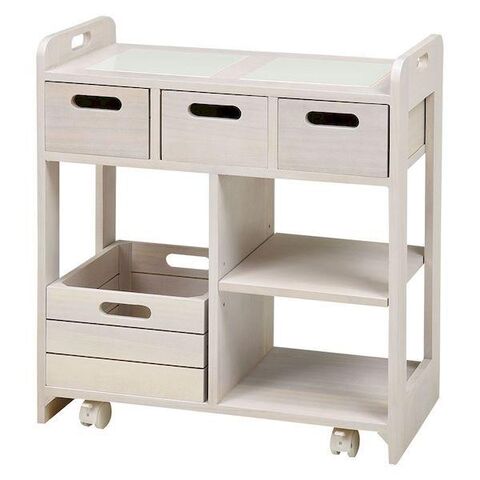 ●対面で使える引出しとダイニング横で使えるサイズ感が魅力の天然木キッチンワゴン。