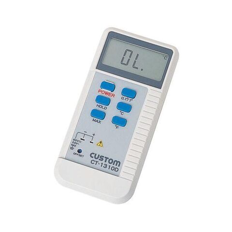 メーカー品番、幅×奥行×高さ(mm) CT-1310D、71×36×148 測定範囲:-50℃~+1、300℃分解能:1℃、0.1℃ 切換可能温度係数:±(0.015%rdg+0.03℃)サンプリング:2回/秒表示:3.5桁LCD表示、オーバの時”OL”マーク表示電池電圧低下表示:+- マーク使用温度・湿度:0℃~50℃(確度保証範囲23℃±5℃)80%RH以下(結露のないこと)保存温度:-20℃~+60℃電源:電池006P(9V)1個質量:約190g(電池は含まず)付属品:電池006P(9V)×1個、ソフトケース×1個 ※センサーは専用センサーを御使用ください。