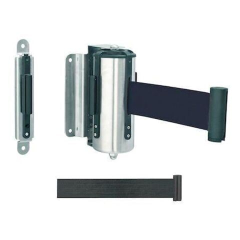 カラー 黒 スタート部/100×116×H177キャッチ部/29×22×H170ベルト:幅49×全長1700材質:ステンレス、PA樹脂質量:スタート部/約600g キャッチ部/約60g.壁面に取り付けて使用するベルトパーテーションです。.ベルト外れを防ぐロック機構付。--回転のイメージ--スタート部分は180°回転するので、様々な角度でセットする事ができます。