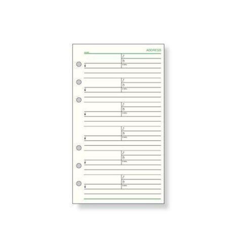 ●1ページに6名のゆったりタイプ。氏名、電話、携帯電話、FAX、Eメール、住所欄が2行あります。水気に強く破れにくい合成紙使用。入数:10枚