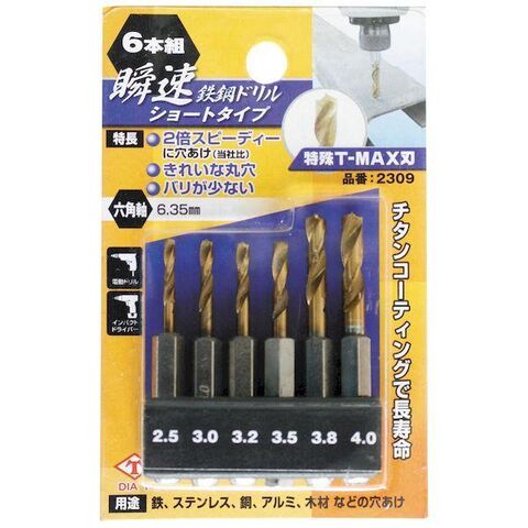 ●用途:鉄・ステンレス・鋼・アルミ・木材などの穴あけ高芝ギムネ製作所 2309 DIA-T 6本組 瞬速鉄鋼ドリル(ショートタイプ) サイズ:2.5,3.0,3.2,3.5,3.8,4.0 4989586134865 ドリル類 作業道具