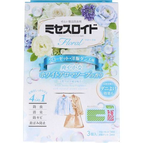 4902407126498 ミセスロイドフローラル 防虫剤 クローゼット・洋服ダンス用 1年 ホワイトアロマソープの香り 3個入【キャンセル不可】